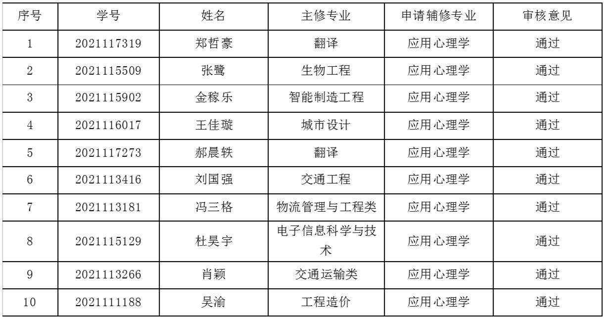 根据《AV大平台 本科生辅修专业修读及辅修学位授予管理办法》和《2022年辅修专业招生通知》,经学生本人网上申请,教学工作组进行审核,结合招收人数,拟同意郑哲豪等10名学生辅修应用心理学专业申请,现予以公示。