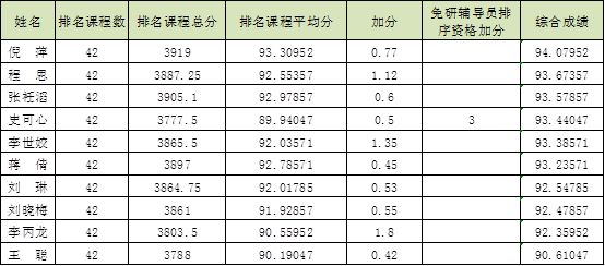 按照平等竞争、保证质量、择优推荐的原则,依照综合成绩顺序由高分到低分的原则,对申请推免生资格进行综合考核,确定拟推荐为免试研究生名单。同时,按照“拟推荐为免试研究生‘后备’人数应限定在指标总数的20%以内”的要求,确定拟推荐为免试研究生后备人选名单。