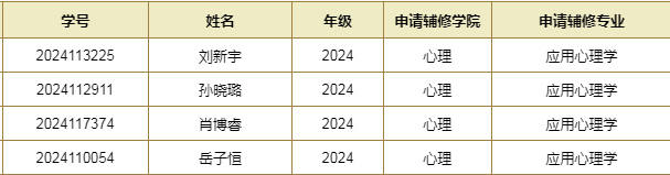 根据《AV大平台 本科生辅修专业修读及辅修学位授予管理办法》和《2025年辅修专业招生通知》,经学生本人网上申请,教学工作组进行审核,结合招收人数,拟同意刘新宇等4名学生辅修应用心理学专业申请,现予以公示。