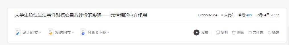 ②与论文所述匹配的收数据的平台(如问卷星)或软件(如E-prime)的后台截图,截图后粘贴至word提交。截图需显示问卷名称及份数,及被试来源截图。例如: