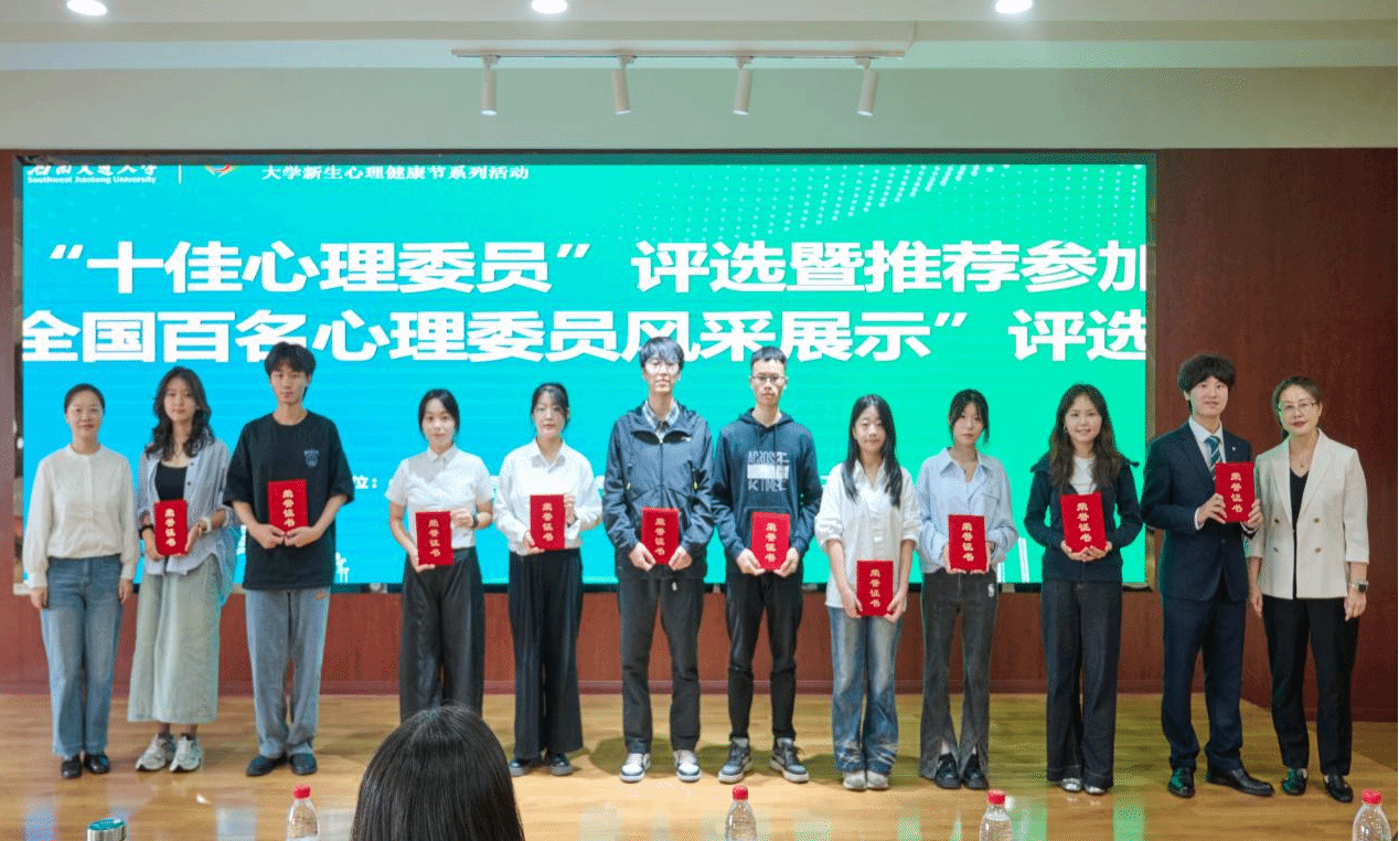 2025年10月11日上午,学校2025年度“十佳心理委员”评选暨推荐参加“全国百名心理委员风采展示”评选会在犀浦校区X5501举行。来自智慧城市与交通学院的张思雨等10位心理委员获评“十佳心理委员”,遴选推荐张思雨(智慧城市与交通学院)、马尔丹·别克沙加尔(公共管理学院)、胥嘉文(利兹学院)参加“全国百名心理委员风采展示”。
