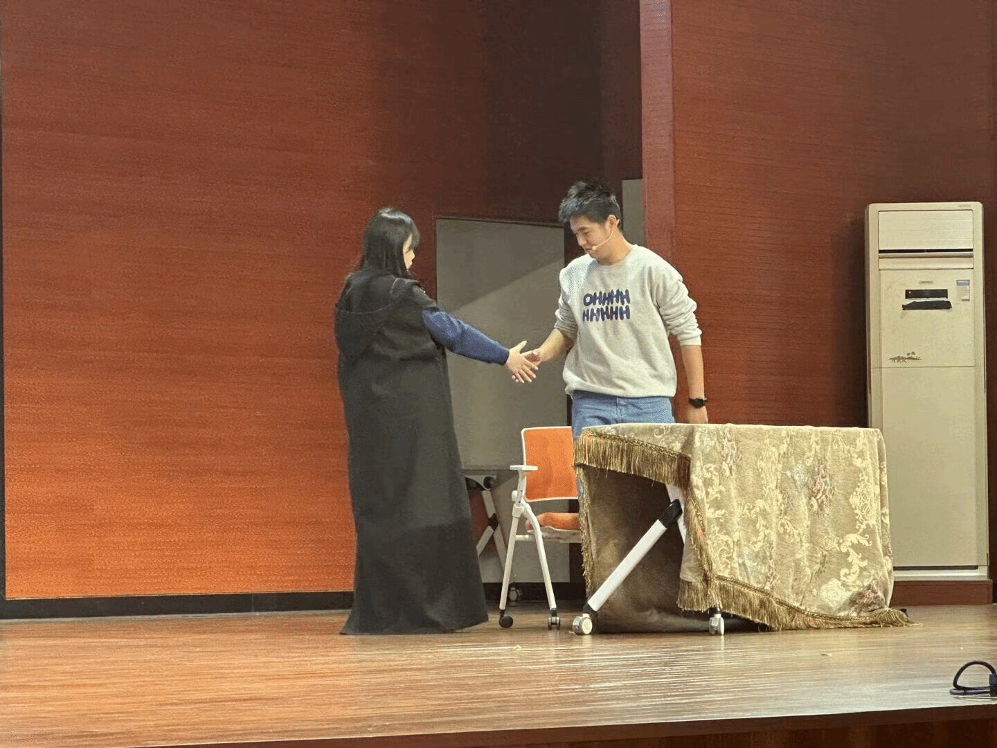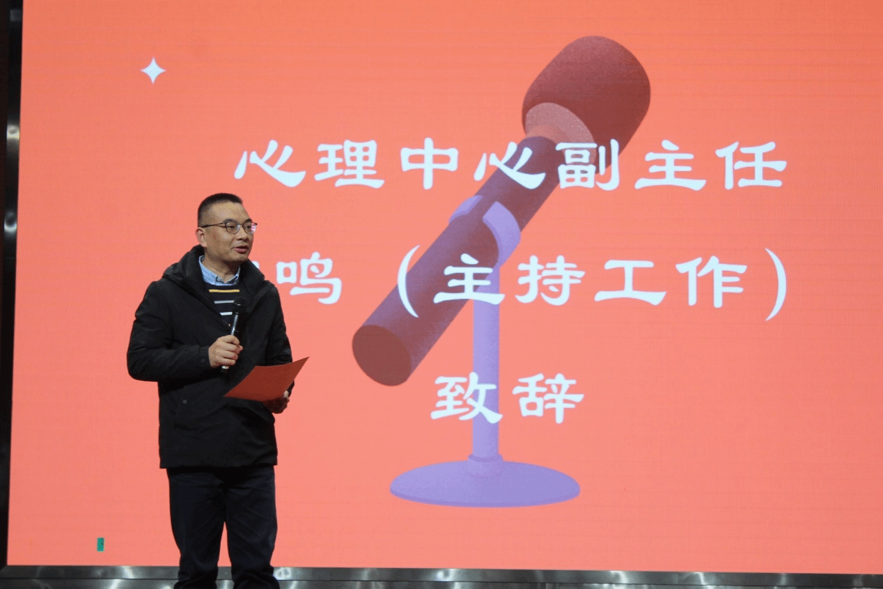 副主任-雷鸣对此次心理剧情景剧大赛进行致辞。雷鸣副主任在致辞环节中首先认同了心理剧在高校心理育人工作中的重要价值,他认为心理剧既是面向普通学生开展心理健康教育工作的技术手段,又能积极疗愈学生的心理障碍;他鼓励同学们认真打磨剧本、排演,希望通过心理剧可以帮助同学解决自己的困难。