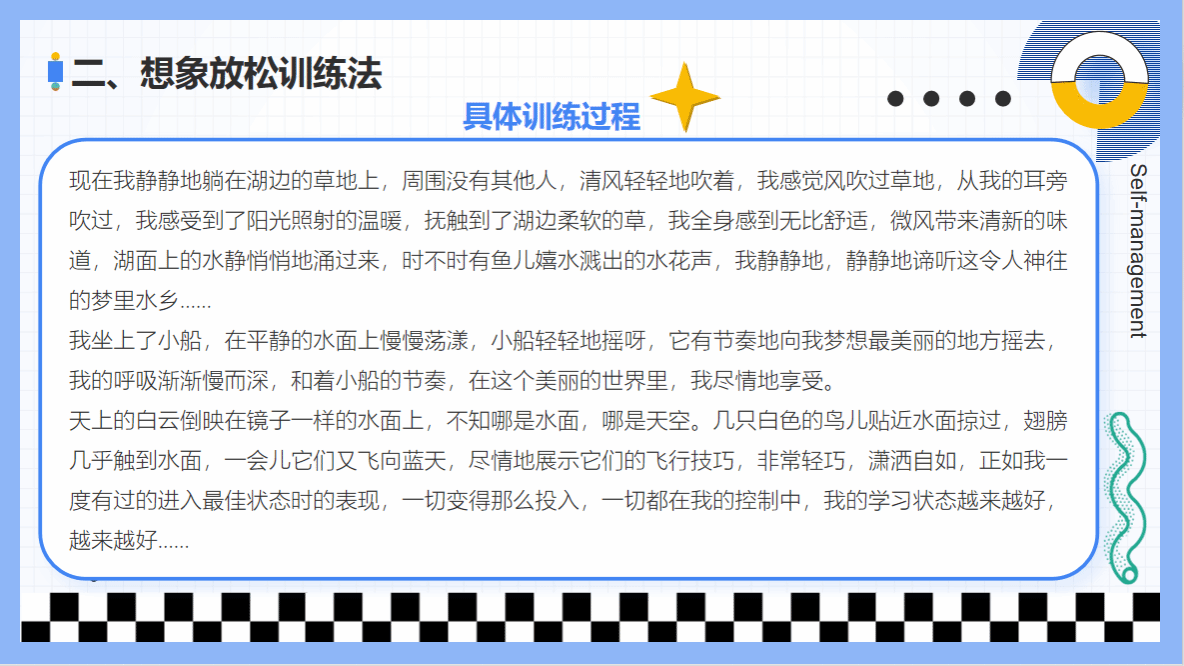 实践出真知,在学习放松技术过程中,我们引导同学们开展了多次的呼吸放松、想象放松的训练,让同学们切身感受到放松技术的作用。