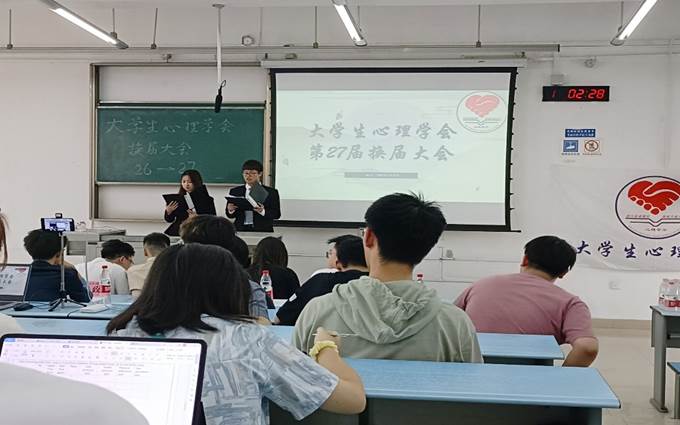 心理学会在x2416教室举办了心理学会换届大会。本次换届大会由活动部张毫军和宣传部张钦璿同学主持,活动部张博骞策划,出席本次大会的有心学第24届、25届主席团部分人员,第26届主席团全体人员和各部门参与竞选的干事。因疫情原因,学会其他干事无法到场,故该大会同时也通过线上方式进行直播。这次换届大会为我校心学补充了新生力量。