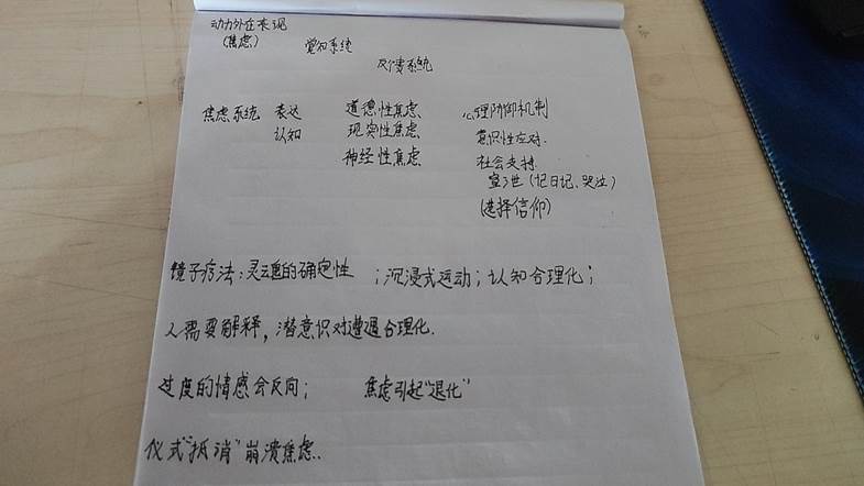 其后,老师向我们讲述了人的心理防御机制,比如意识性应对问题,以记日记、哭泣的方式宣泄,或者选择信仰,都属于心理防御。