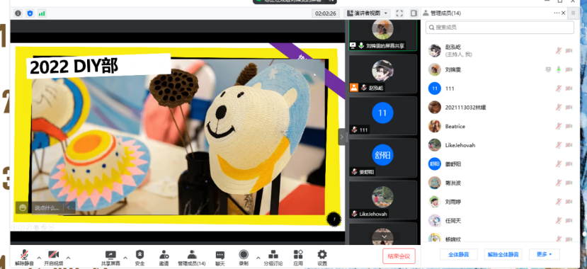 2022 年5月26日晚上八点,AV大平台 创造学会在腾讯会议举办了创造学会换届大会。本次换届大会由会长赵泓屹同学主持,绘影部姜舒阳同学策划,出席本次大会的有创造学会全体会员,各部门参与竞选的干事。