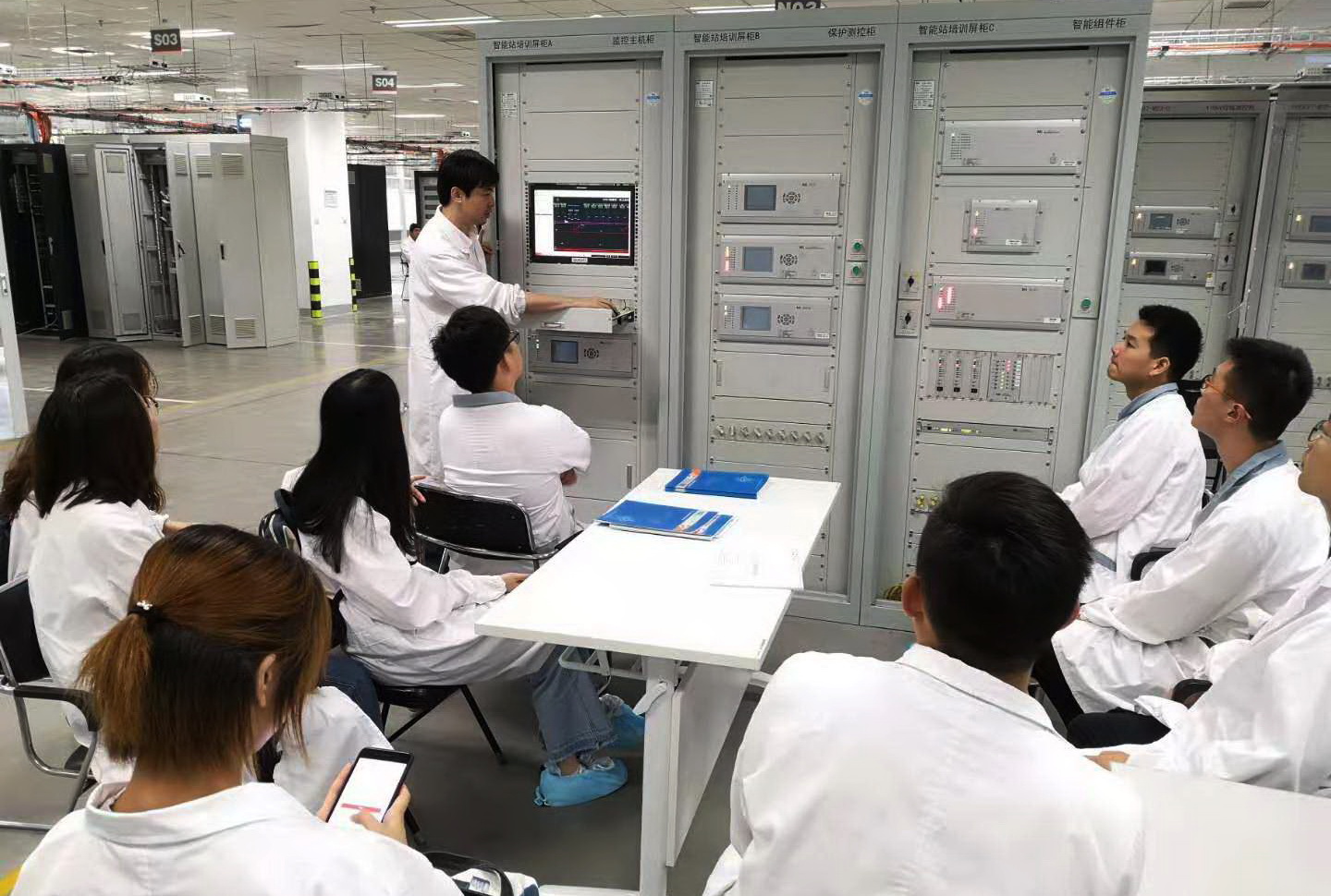 7月24日,实践队员进行了工程试验岗位实践操作。刘工带领实践队员来到南瑞继保公司的试验中心,这里主要负责产品的出厂调试和验收。实践队员参观了用于单装置出厂测试的工程化单装置整机智能测试系统,随后来到试验部。上百个屏柜整齐有序的摆放在整个大厅,所有单元屏柜的尺寸和颜色都是统一的。屏柜在大厅的摆放位置以及屏柜内部装置的摆放位置的确定都是由公司的一套排布系统签收完成。整套排布系统能够简化工作流程,提高工作效率,同时方便实验助理进行实验。整个试验部又细分为保护组、综合自动化组、海外组等。保护组主要负责保护装置的调试,综合自动化组主要负责调试测控装置和通讯装置。海外组主要是负责海外项目设备的出厂调试和验收。目前,南瑞继保公司涉及到100多个国家的海外业务。海外平柜需要根据各个国家的工作习惯和场地特性私人订制。海外组的负责人还为我们介绍了埃及、印度,印度尼西亚以及英国等国家订制的保护柜和控制柜各自的特点。短暂的午休过后,实践队员来到南瑞继保公司的实验中心,吴春宇工程师指导实践队员动手进行试验操作,介绍了国内各种电压级的变电站,细心讲解了如何通过PT装置转变电压,使得能用二次设备监视和保护一次设备,并交流解答了大家的疑问。吴工还为大家讲解了智能变电站的系统结构与传统变电站的差异,以及其优势与便利。同学们在吴工的指导下开展了智能站保护测控柜实操培训,学习了变电站的一些常见故障的检测和解决方法。