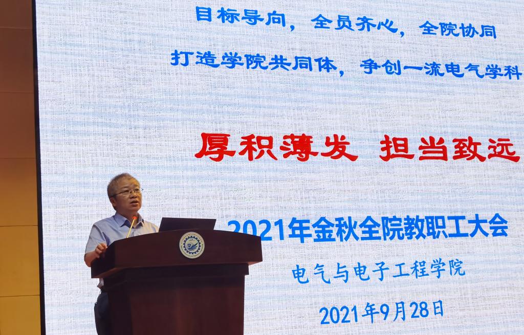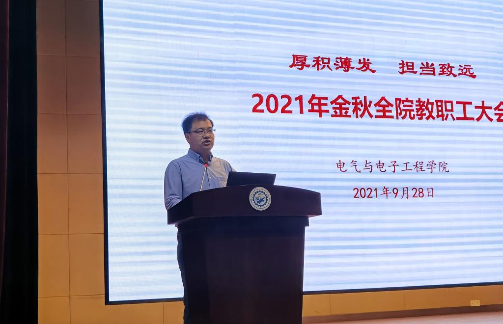 2021年9月28日上午,电气与电子工程学院在电气大楼报告厅召开了2021年金秋全院教职工大会。大会主要内容有学院2021年上半年工作表彰、党风廉政建设和师德师风建设宣传教育月宣讲、学院近期工作报告、电气专业本科培养计划修订说明、学院安全财务及公用房情况通报。大会由党委书记陈晋主持。