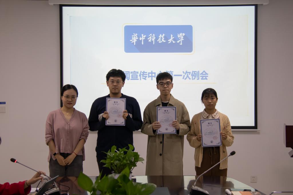 会议的第一项是换届大会。石子倩为新任记者部部长陈迎晓、新媒体部部长秦于原、主编付正坤颁发聘书。相信新闻宣传中心在他们的带领下必将百尺竿头更进一步。
