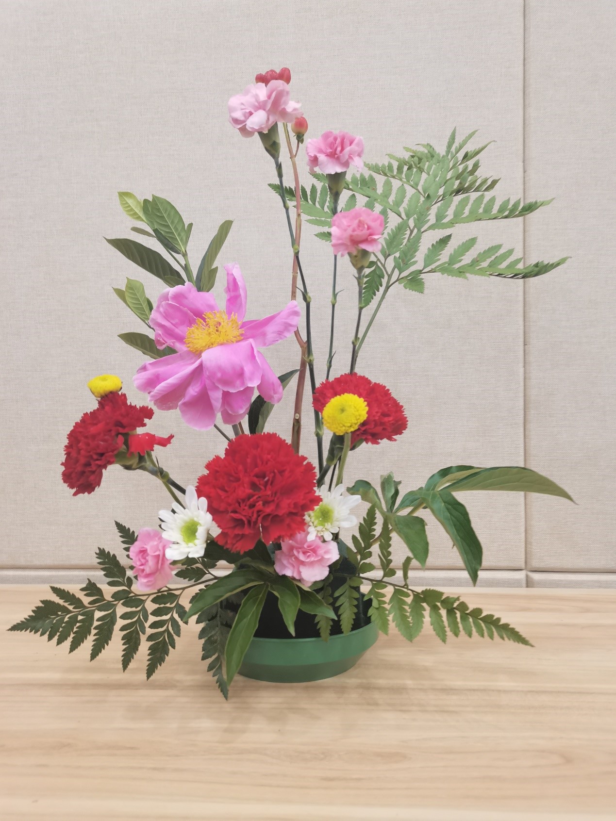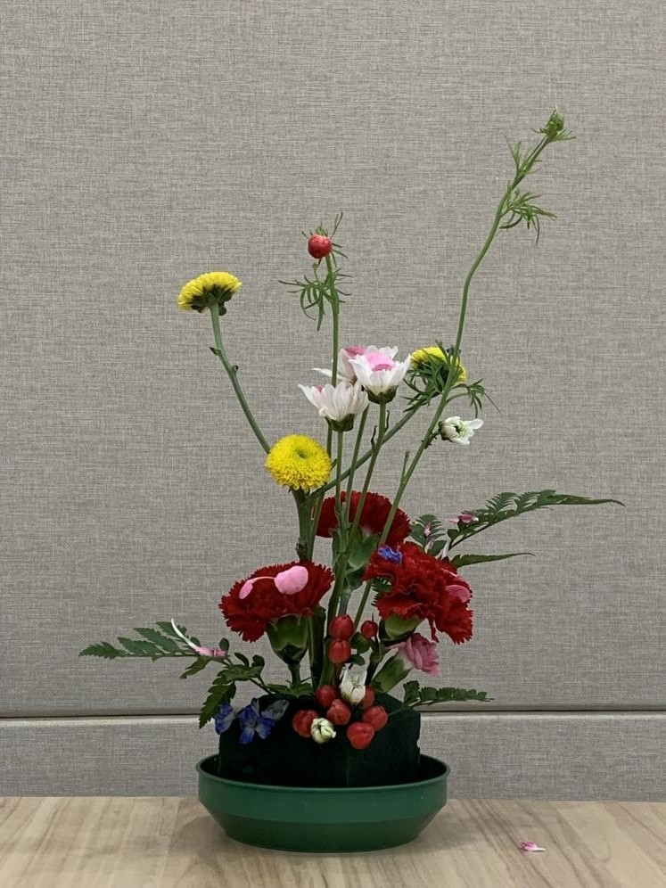 设计思路:三朵艳丽夺目的象征着母爱的康乃馨作为这次插花作品的主花,代表华中科技大学于我们,就像母亲一样温柔、可靠。三朵康乃馨拥簇的一朵芍药直立而起,代表着已经毕业的华科大学长、学姐们,在学校的怀抱中已然成熟独立,可以为母亲遮风挡雨了。而三朵康乃馨下面的颜色较杂的群花,代表着仍在庇护下成长、深耕的在校学子们。底部颜色无奇的叶草们则代表着科研工作的辛苦和科研生活的平淡,也代表着为了科研甘于坐冷板凳的工作在幕后的科研工作者们,顶部三朵粉花围绕着的几颗石榴果,则代表着我校科研的硕果累累。