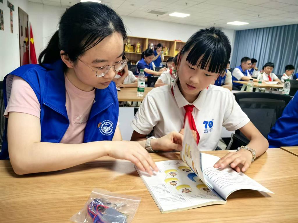 电气本科23级卓越班竺奕帆为大家做电气学院原创科普读物《喻小电历险记》导读,通过问题引导少先队员在书中寻找答案,校外辅导员们则为队员们进一步讲解与提示,附小的少先队员争相举手回答,也对电磁学知识产生了更加浓厚的兴趣。