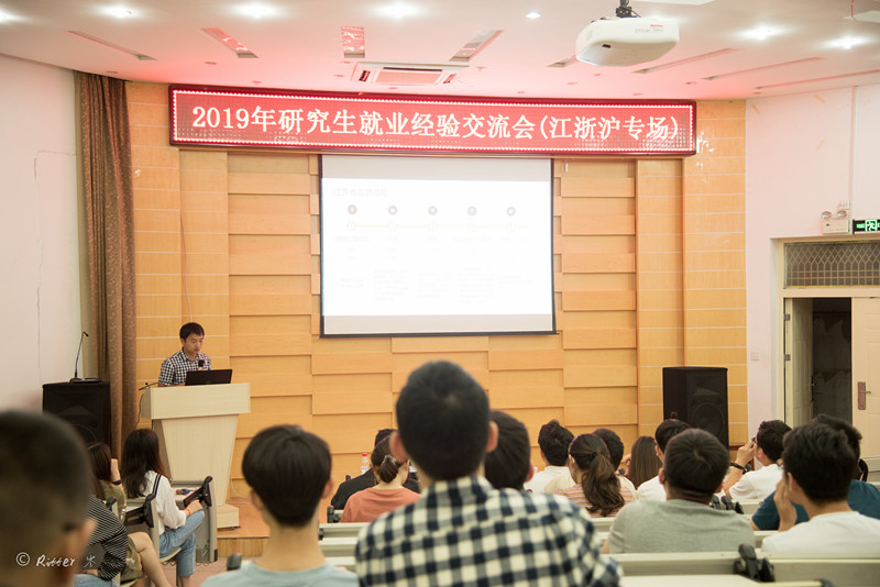 漆家炜向现场观众介绍电气学院研究生毕业去向和江浙沪地区就业概况。分别引用18届以及19届数据讲述总体就业概况和江浙沪地区就业概况。从地区上看,18届博士毕业生70%于湖北、广东、湖南就业;硕士毕业生70%就业于湖北、广东、江苏、浙江、上海。行业上看,18届毕业生中近一半前往电网公司,共135人。19届毕业研究生中,前往江浙沪地区的博士毕业生6人、硕士毕业生50人。博士生以科研院所为主,研究生以电网公司为主。