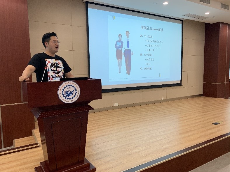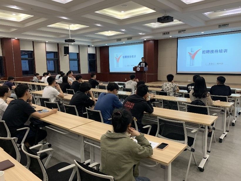 本科18级辅导员、院团委书记柳子逊老师为中心成员进行了接待礼仪培训。他从精神面貌、服饰穿着、交流谈话、乘车礼仪等方面细致讲解了商务接待礼仪的基本知识,强调了良好的礼仪对于塑造学院良好形象、传播就业沟通信息、提高招聘合作效率的重要意义。最后,柳子逊鼓励大家在接待服务中提升自己的职业素养和交际能力,争取早日找到理想的工作。