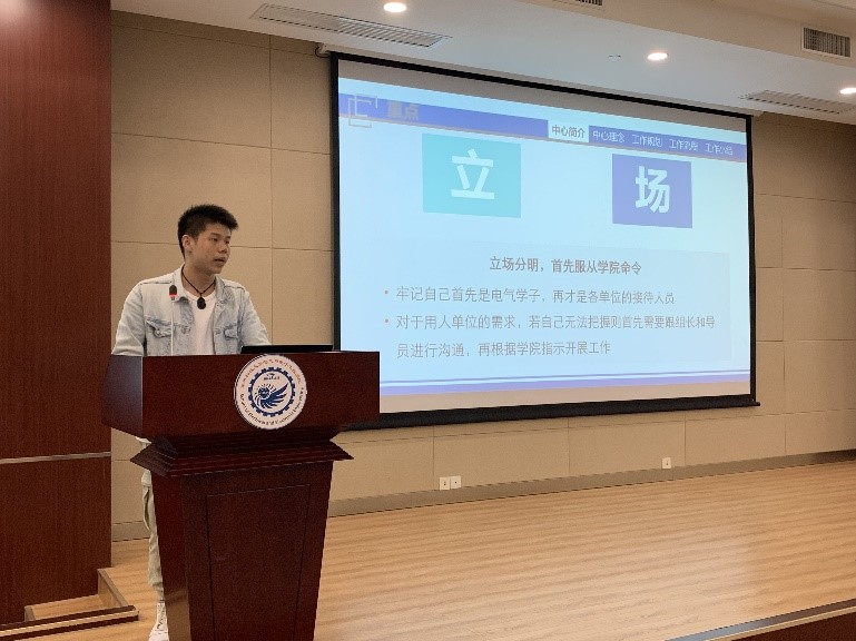 最后,中心2021届的两位优秀代表分享了他们的接待服务经历和心得体会。北方接待组组长宫鑫从亲自接待20余家企业的经历出发,期望大家在态度上做到不卑不亢,提醒大家做好前期准备工作,并与组长和辅导员保持随时沟通,尽力解决企业提出的特殊需求或突发状况。他还鼓励组员在做好职业规划的同时加强对于队友的了解,不断强化原有能力,争取挖掘新能力。江浙沪接待组组员邓策着重强调了中心组员必须立场分明,时刻牢记自己电气学子的身份,首要服从学院管理;对于用人单位的需求若自己无法把握,需要及时与组长及辅导员沟通,按照指示开展工作。邓策还用几个小案例突出了提高换位思考能力、切实增强服务意识的重要性。