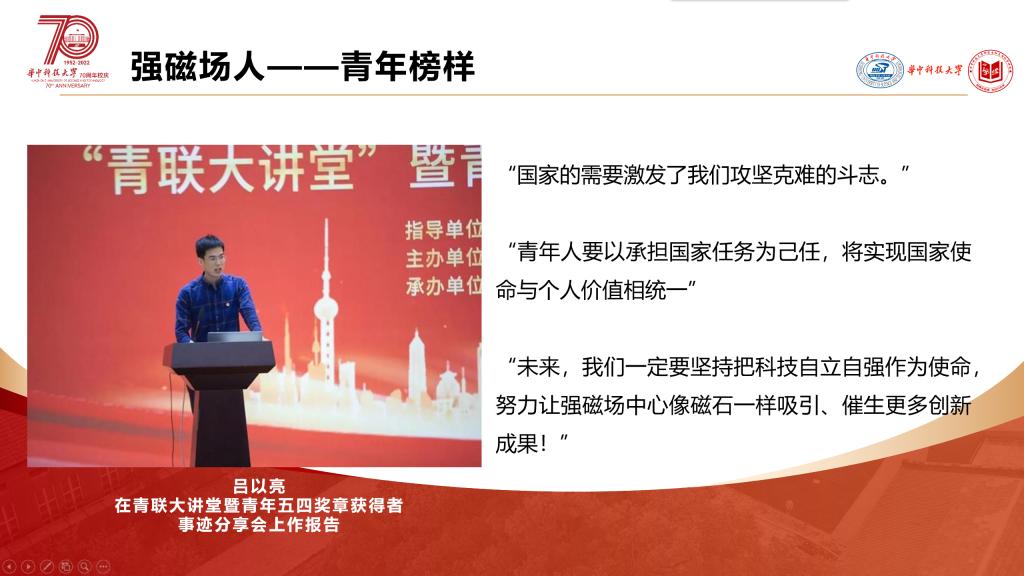 走近脉冲强磁场,学习科研榜样。活动第三项议程,由电气硕士2105班党支部书记、校研究生红色理论学讲团讲师楼奕轩为全体同志带来《打造最强强磁场》微党课分享。