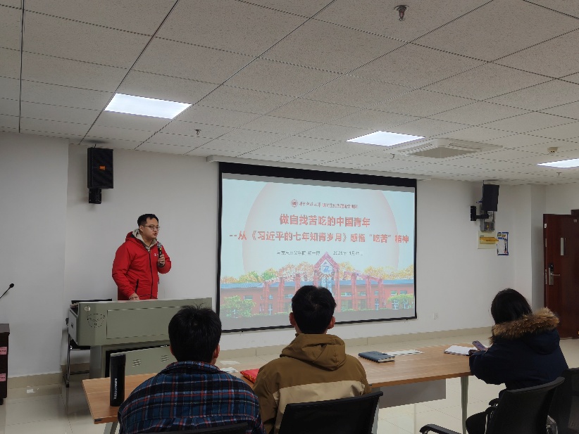 首先,马克思主义学院的杨一博同志向支部成员进行了做自找苦吃的中国青年——从《习近平的七年知青岁月》感悟“吃苦”精神的理论分享会。本次分享会先介绍了习近平总书记在梁家河七年知青岁月,他与乡亲们同吃住同劳动,带头打坝、克服重重困难坚持读书,劳动之余不忘学习。分享会指出,新时代青年需主动走出舒适区,在基层实践等磨砺中坚定信念、增长才干,传承吃苦精神,勇担时代重任。