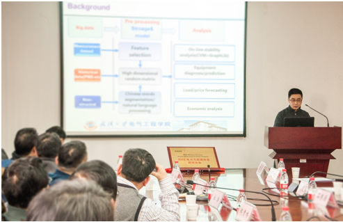与会人员合影后,大会进入了第二阶段——武汉地区工业界与学术界交流会。共有四位代表汇报了研究成果。国网电力科学研究院武汉南瑞有限责任公司防雷输电事业部总经理谷山强结合电网雷电防护关键问题介绍了当前武汉南瑞对电网雷电防护技术的研究进展;武汉大学王波副教授分享了其研究团队在电网大数据应用中的建模思路;国网湖北省电力有限公司电力科学研究院周鲲鹏副主任介绍了湖北电网的运行特点;最后华中科技大学毛承雄教授汇报了其团队在电子电力变压器方面的研究成果。