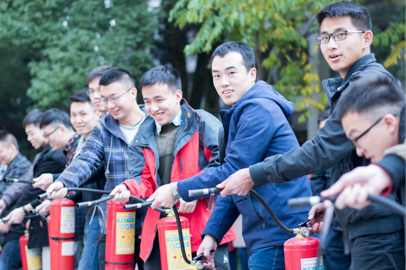 消防局和保卫处工作人员以干粉灭火器为例,对灭火器材的实际操作做了详细的指导。同学们一边听着讲解,一边拿起现场准备好的灭火器,依次颠倒瓶体、除掉铅封、拔掉保险销,然后左手握住喷嘴、右手提着压把,最后在距离模拟起火点两米处对准根部喷射干粉,并成功将起火点扑灭。现场的氛围十分热烈。