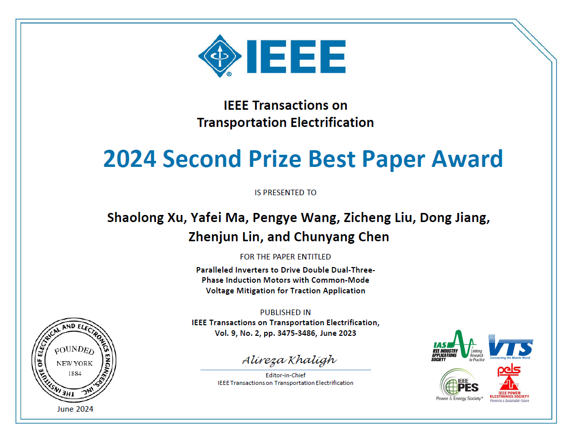 在本项目的合作中,双方共同开发了双三相异步牵引电机和全SiC双三相牵引变流器,并合作撰写论文“Paralleled Inverters to Drive Double Dual-Three-Phase Induction Motors with Common-Mode Voltage Mitigation for Traction Application,”(应用于牵引的带共模电压抑制的并联逆变器驱动双三相感应电机),发表于交通电气化领域国际著名SCI期刊IEEE交通电气化汇刊(IEEE Transactions on Transportation Electrification,影响因子7.0)2023年第九期。近日IEEE交通电气化汇刊发布了2023年度最佳论文,该篇论文获得了年度最佳论文二等奖,是该期刊创刊以来中国大陆单位第二次获得这一奖励。这一荣誉是对校企合作成果的重要肯定。