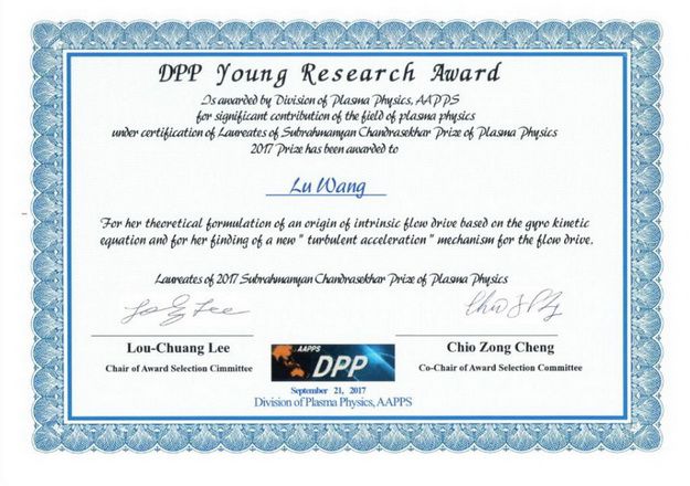 2017年9月21日,我校聚变与等离子体所王璐副教授,荣获亚太物理学会首届等离子体物理大会(1st Asia-Pacific Conference on Plasma Physics)基础等离子体物理组“杰出青年科学家”称号,以嘉奖其依据回旋动理学方程对驱动自发转动的源的理论研究成果,以及提出“湍动加速”的新的流驱动机制。