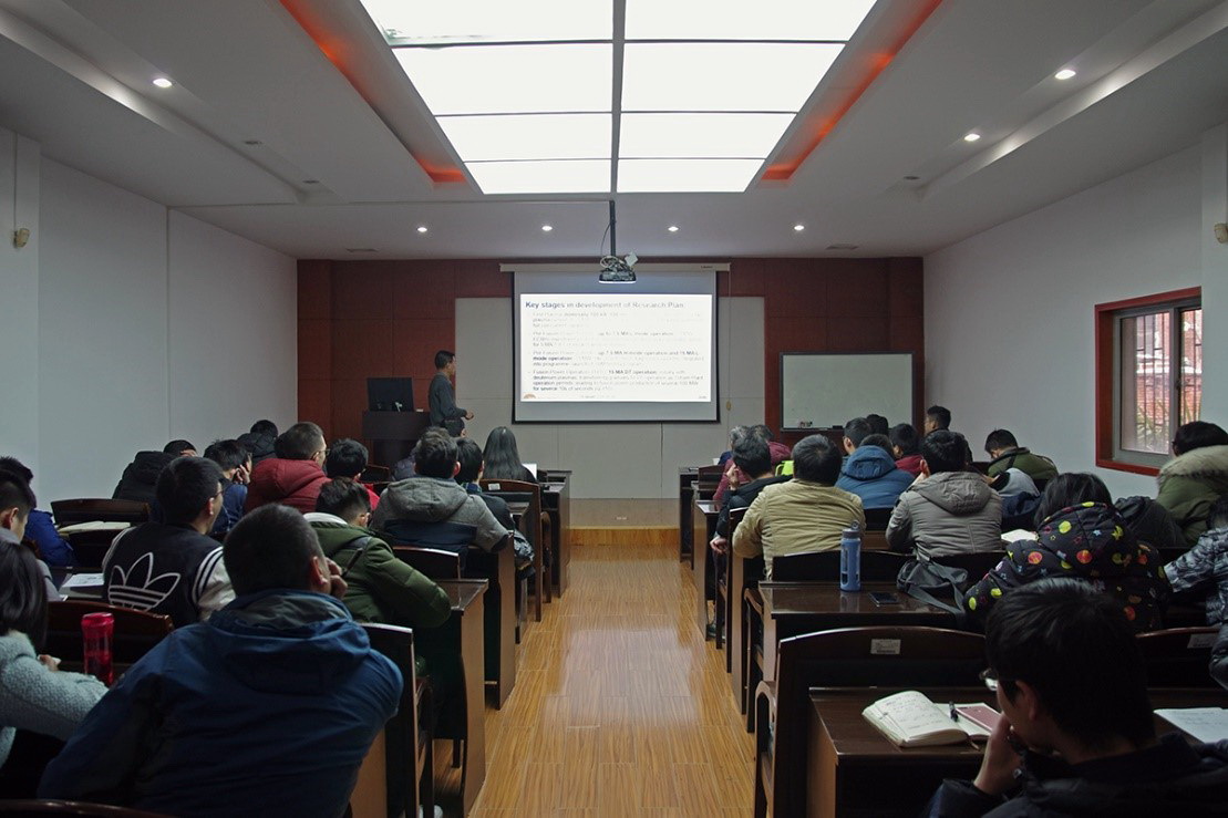 18日上午,武松涛在聚变所相关人员的陪同下,参观了华中科技大学强磁场实验中心、电气学院动模楼和聚变与等离子体研究所。当日下午,武松涛在聚变所二楼报告厅,就ITER项目的历史、现状和未来,以及相关各国的聚变研究和装置建设,向我所师生进行了近3个小时的详细报告。武松涛特别强调了国际项目中团队协调和统一规划的重要性,并对ITER前期并不顺利的磨合做了详细的分析。武松涛指出,国家的支持是大型科研项目进行的根基,没有持续的政策、资金和人员的支持与投入,聚变这种需要长足投入的科研项目是很难取得建设性成果的。