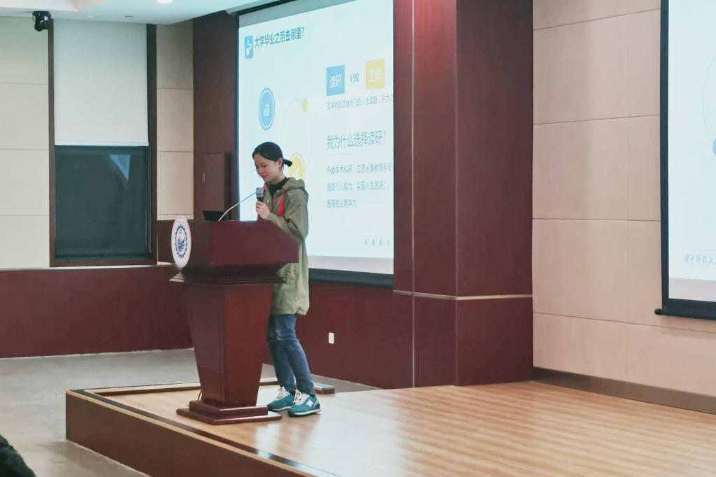 辅导员石子倩进行了总结发言。她表达了对三位嘉宾的赞赏和敬佩,并且对在座的同学们寄予和殷切的期望。在班会提问交流对环节,同学们提出了关于科研、保研和就业相关的问题,各位嘉宾、辅导员和班主任都提出了自己的见解,为同学们答疑解惑,班会圆满结束。