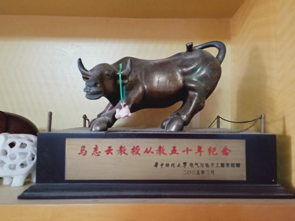 展示架上摆满了世界各地的风物,都是老师退休以后收集来的。每年老师都会出国旅行,前往两到三个国家或者地区,观览世界各地的民风民俗。马老师一件件介绍着,笑说自己“已经把五大洲走完了”。前年是新西兰、澳大利亚,去年是巴尔干、泰国,今年又与老友相约国庆后去坐地中海游轮。不远处还有一件特殊的展品吸引了我们的目光,是一头耕牛形象的雕塑——华中科技大学从教50周年纪念,落款2005年3月。看着老师硬朗的身子骨、饱满的精神气,身为后辈的我们也深受触动。活到老、学到老、玩到老,人生有无限种精彩等待着我们探寻。