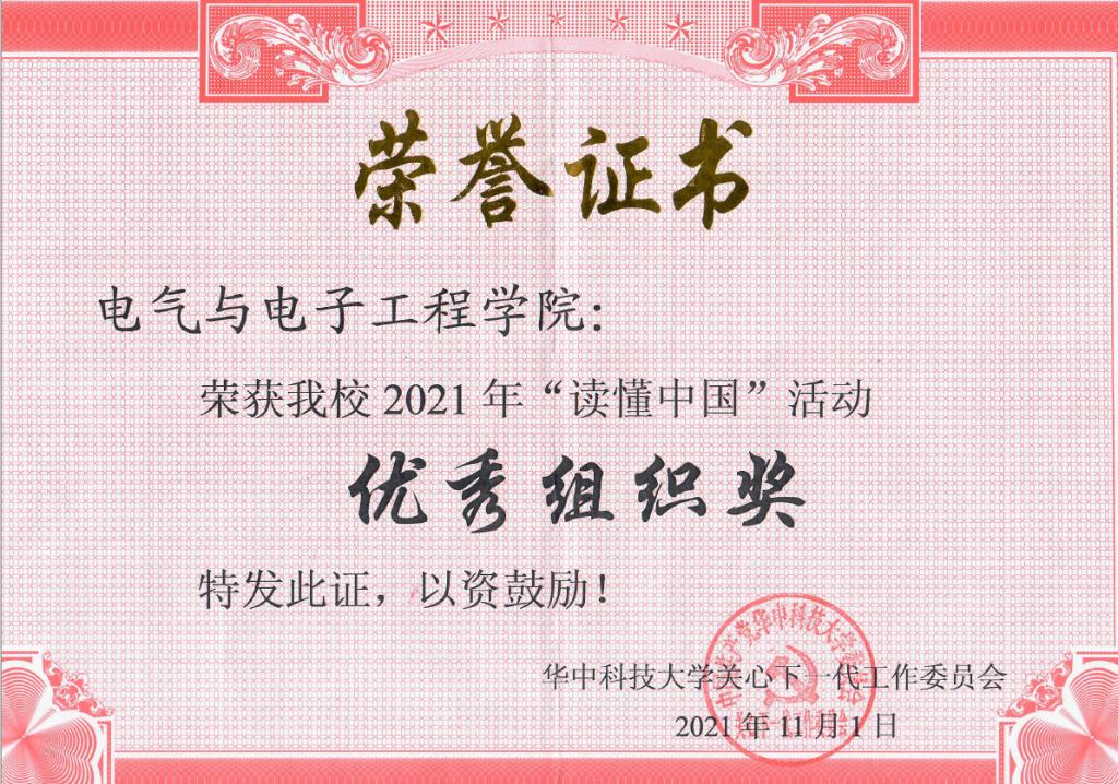 2021年11月1日,华中科技大学关工委在老年活动中心举行“讲好入党故事——传承红色基因”——2021年“读懂中国”活动颁奖仪式暨作品展演。电气博士2002班党支部作品《聆听李劲入党故事,传承电气人家国情怀》荣获“最佳微视频奖”(作者:康鸿凯、杜立蒙、万智渝、王雨橙、陈奥特,指导教师:朱瑞东、李毅、许文立)和“优秀征文奖”(作者:曾颖琴、万智渝、叶菁菁、刘少波,指导教师:朱瑞东、李毅、许文立)。电气与电子工程学院荣获“优秀组织奖”。