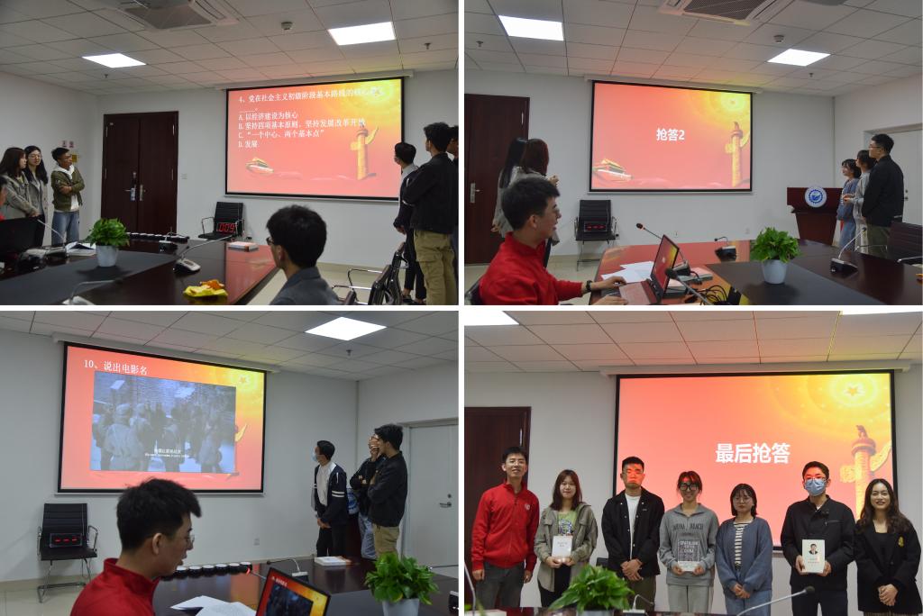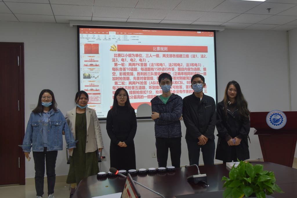 最后,两支部开展了“学史增信、献礼百年”党史知识竞赛,全员参与,以赛促学,在互动中强化学习效果。题型包括选择、填空、影视竞猜,内容涵盖了建党伟业、疫情阻击、脱贫攻坚、“两会”等方方面面。现场组建的六支队伍两两对阵,各组选手沉着冷静、从容不迫,比分胶着、你追我赶,气氛紧张热烈、阵阵掌声,展现出了两支部党员丰厚的知识储备、敏捷的思维能力和优秀的协作能力。最终法学院队伍获得了比赛的胜利,叶雅安为其颁发了党史学习书籍作为冠军奖励。