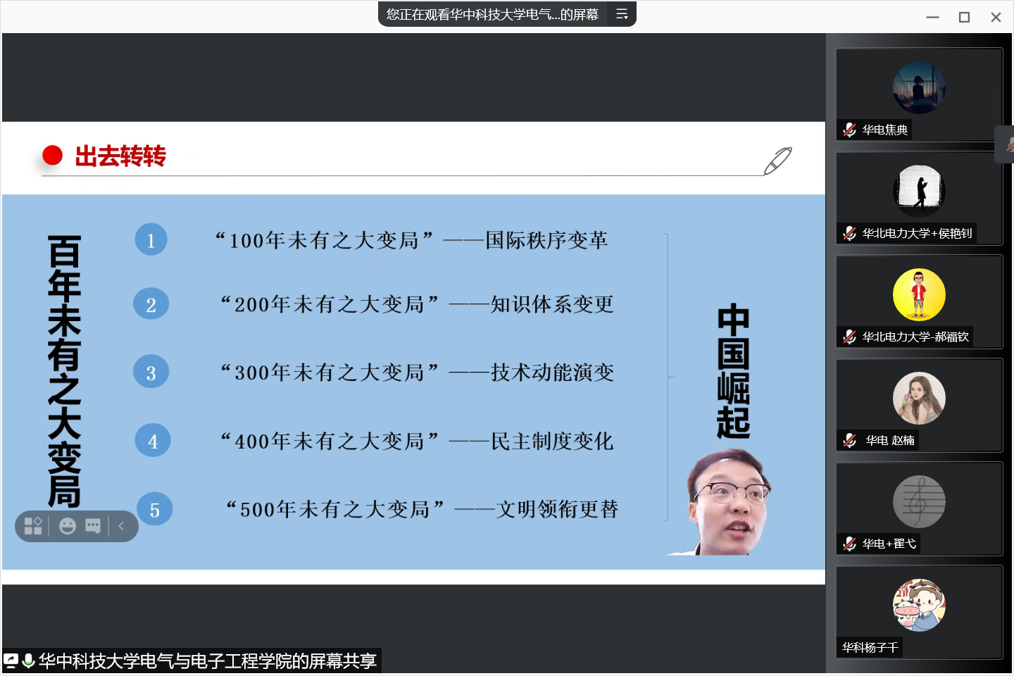 来自清华大学电机系、西安交通大学电气工程学院、华中科技大学电气与电子工程学院、浙江大学电气工程学院、重庆大学电气工程学院、上海交通大学电子信息与电气工程学院、武汉大学电气与自动化学院、华北电力大学电气与电子工程学院八所高校院系研究生近500人,共同以线上线下相结合的方式听取讲座。