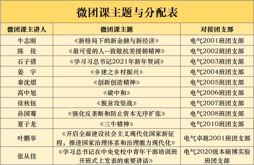 1月20日至2月9日,为加强电气学院团支部的思想引领和组织建设,在学院党委的指导下,学院团委以“建党百年赓续砥砺奋进,初心不忘再续电力荣光”为主题,组织团学骨干宣讲团,深入低年级团支部,线上开展微团课主题宣讲,用青春的视角,青年的话语献礼建党一百周年。