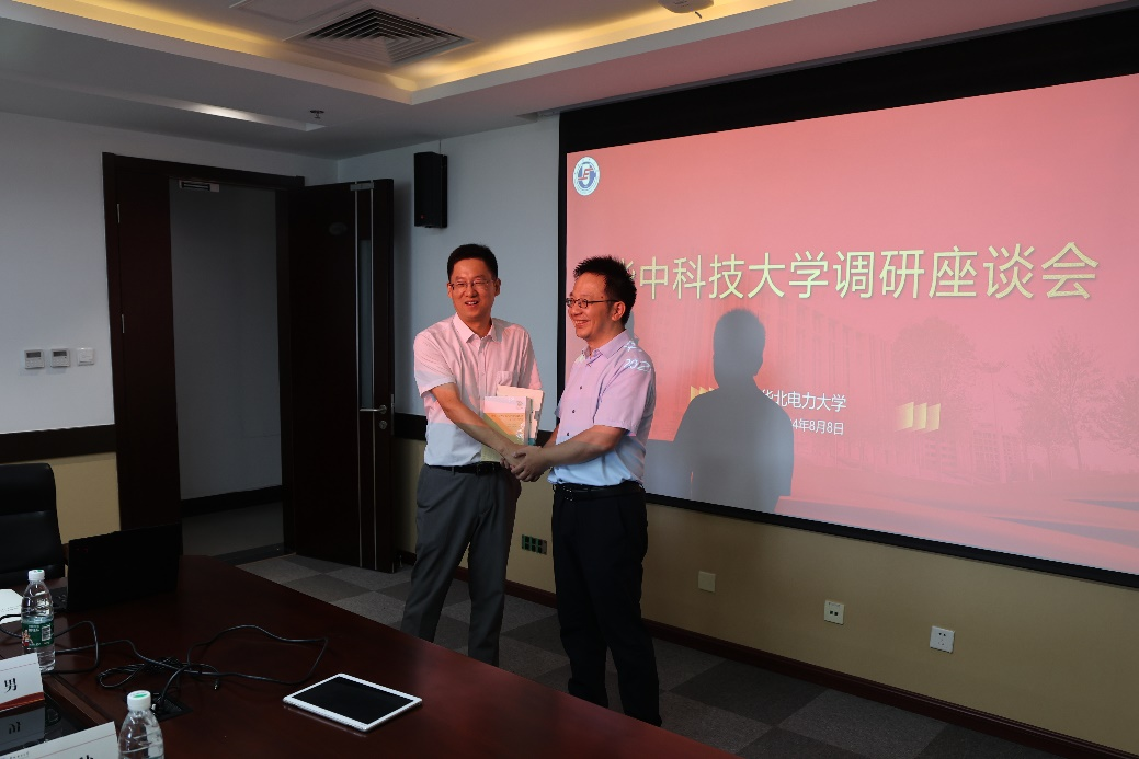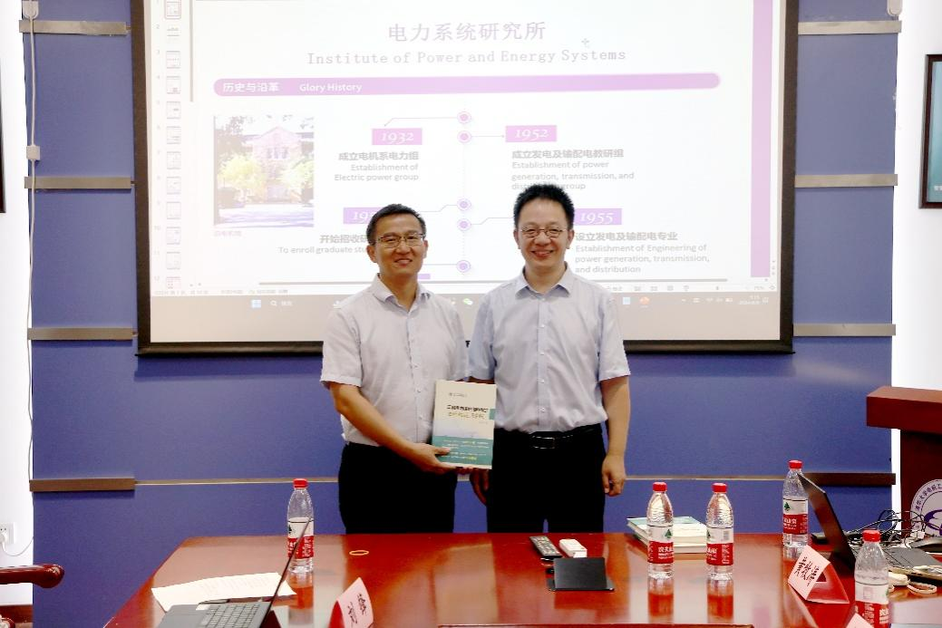 电力系主任姚伟表示,两校具有深厚的渊源,长期以来互相支持、携手并进,并代表华中科技大学赠送了电气学院院史和陈德树先生的专著《现代电力系统继电保护运行理论与实践》。陈德树先生是著名电力系统专家,我国微机继电保护的主要开拓者之一,“顾毓琇电机工程奖”获得者。此书是陈老94岁高龄带给读者朋友们的礼物,更是他深刻践行勇攀高峰、敢为人先的科学家精神的生动体现。华北电力大学电气与电子工程学院副院长刘念表示,两校友谊源远流长,始终保持紧密合作关系。随后双方介绍了与会的各位老师。