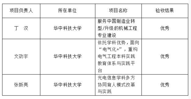 据悉,经项目申请、专家评审,“新工科个性化人才培养模式探索与实践”等589个项目通过验收,其中96个项目验收结果为优秀。华中科技大学共有3个项目被评为优秀,优秀率100%。