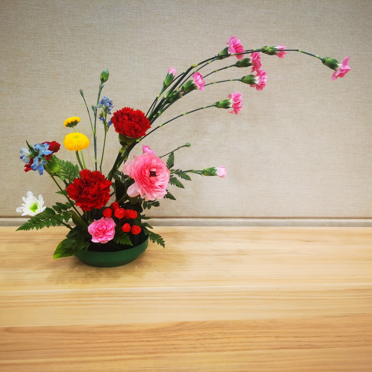 设计思路:三朵艳丽夺目的象征着母爱的康乃馨作为这次插花作品的主花,代表华中科技大学于我们,就像母亲一样温柔、可靠。三朵康乃馨拥簇的一朵芍药直立而起,代表着已经毕业的华科大学长、学姐们,在学校的怀抱中已然成熟独立,可以为母亲遮风挡雨了。而三朵康乃馨下面的颜色较杂的群花,代表着仍在庇护下成长、深耕的在校学子们。底部颜色无奇的叶草们则代表着科研工作的辛苦和科研生活的平淡,也代表着为了科研甘于坐冷板凳的工作在幕后的科研工作者们,顶部三朵粉花围绕着的几颗石榴果,则代表着我校科研的硕果累累。