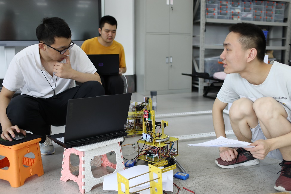 图4为此次电赛控制组火热紧张制作的现场照片。控制精妙的运动跟踪系统、相互追踪的红绿激光点,他们在四天三夜的制作时间内尽善尽美地完成了自己作品,并且顺利达成了题目所要求的指标,取得了近年来最好的成绩。这次国赛既是一次对个人毅力的考验,也是难得的与志同道合的伙伴共同进退的机会。独木不成林,单丝不成线。队员们拧成一股绳的干劲是斩获佳绩的关键力量。每个人都能发挥自己的长处,无论是互相交流解决问题,还是共同努力克服困难,每一位队员的付出都是不可替代的。