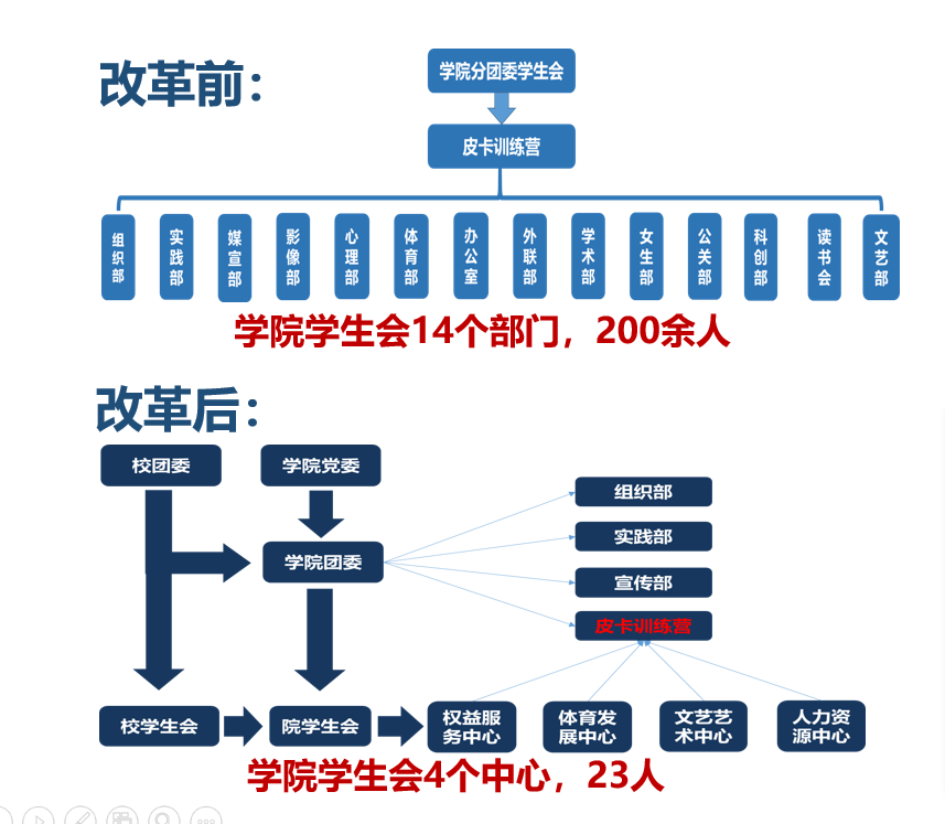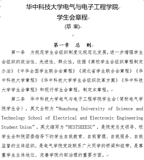 作为唯一校团学改革试点单位,电气学院率先精简职能,打造一个兼具引领、凝聚、服务等职能的简单阳光的学生会。学生会规模从改革前的14个部门、200余人到现在凝练的4个中心、23人;所有学生会成员均是通过层层推荐、筛选、确认出的在学习、学生工作、个人品行均具表率作用的优秀青年。同时,电气学院学生会率先按照团学改革要求完成院系学生会章程的修改,为兄弟院系探索出可信赖的样本。