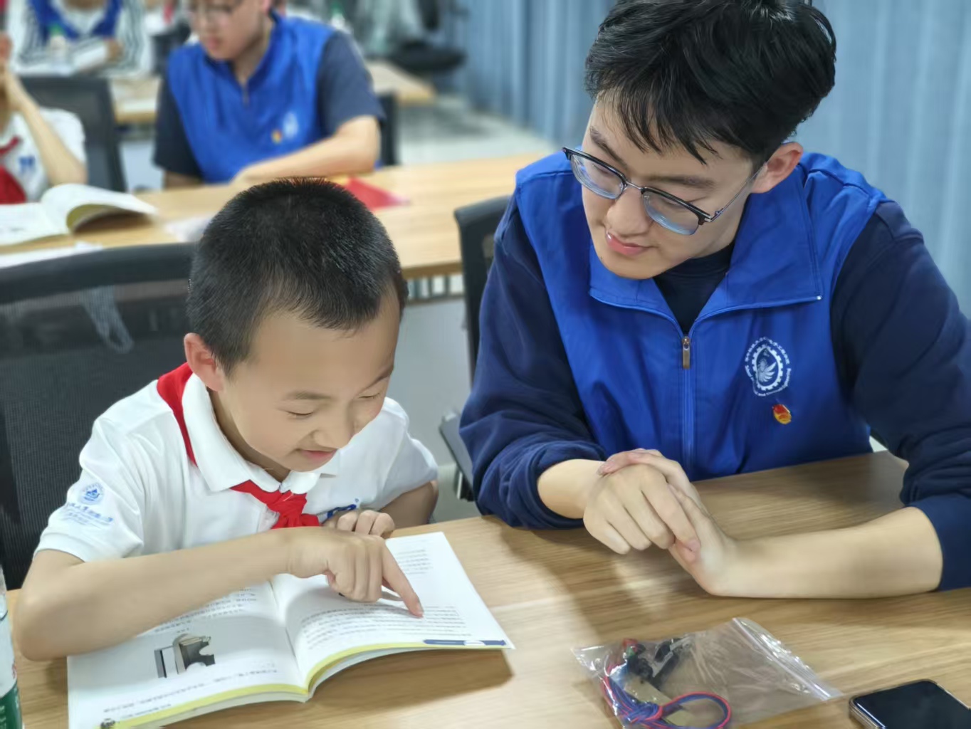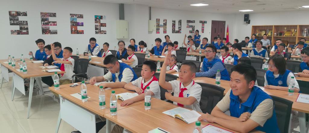 电气本科23级卓越班竺奕帆为大家做电气学院原创科普读物《喻小电历险记》导读,通过问题引导少先队员在书中寻找答案,校外辅导员们则为队员们进一步讲解与提示,附小的少先队员争相举手回答,也对电磁学知识产生了更加浓厚的兴趣。