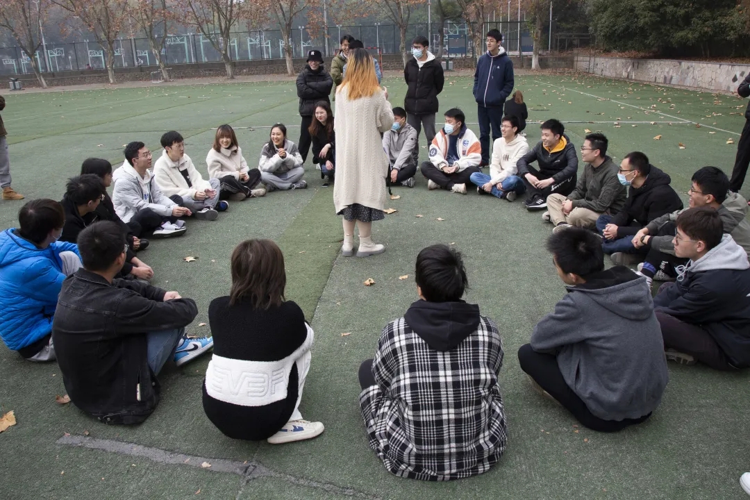 比赛正式开始之前,两班团支书按照各班人数将同学们分成了5组,每组大概10人。在主持人龙情同学和现场工作人员的组织下,各小组围成一个圈,展开了一场别开生面的自我介绍,并为自己所在的小组起好了队名。此次“传承红色基因,践行初心使命”特色团日活动趣味运动会一共有四项游戏:123木头人、数7游戏、背对背奔跑、党史知识竞答,游戏采用积分制确定最终获胜队伍。