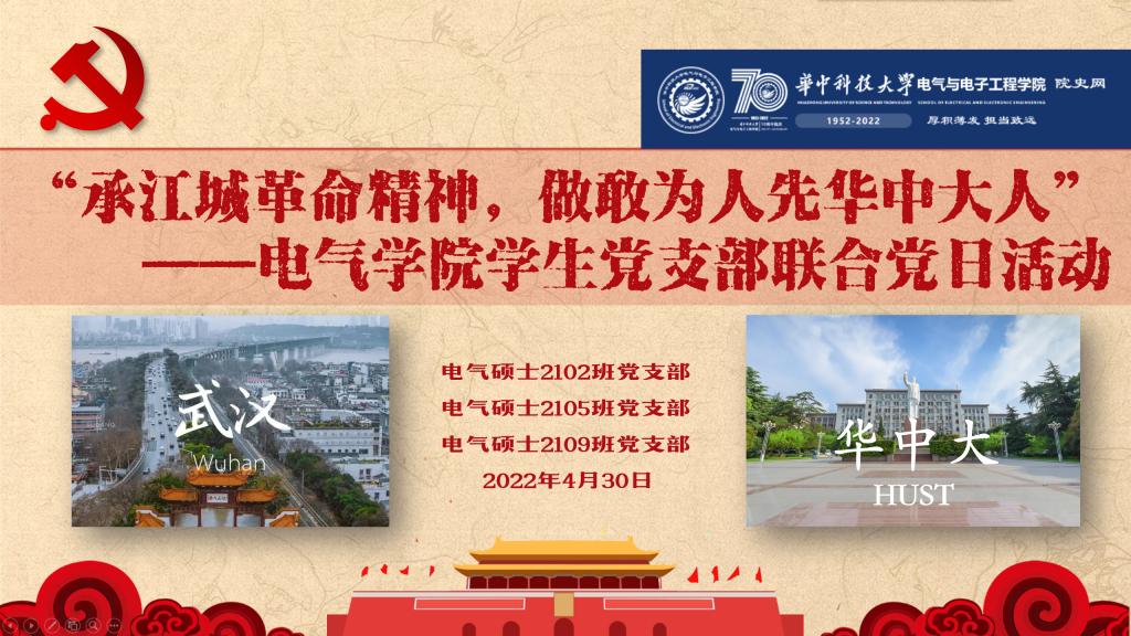 为丰富党史理论学习形式,促进党日走深、学习走实,2022年4月30日上午9点,电气学院硕士2102班党支部、硕士2105班党支部、硕士2109班党支部在电气大楼B203报告厅开展了“承江城革命精神,做敢为人先华中大人”联合党日活动,以“线上云参观”、“线上云打卡”形式开展主题实践,在回顾党的历史、传承红色精神的同时,坚定新时代“华中大电气人”的使命和担当,献礼华中大70周年校庆及电气学院70周年院庆。
