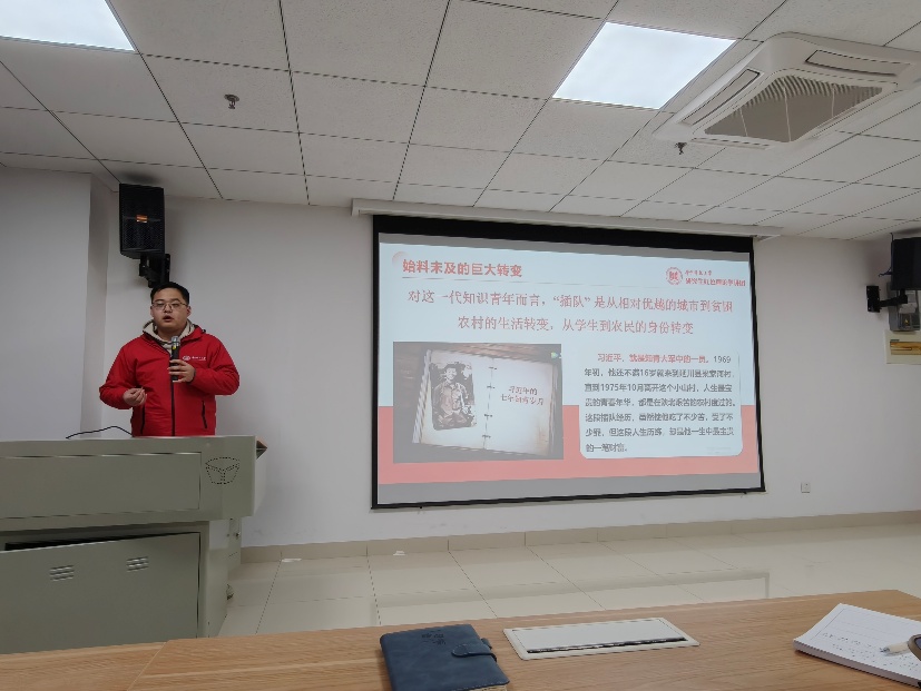 首先,马克思主义学院的杨一博同志向支部成员进行了做自找苦吃的中国青年——从《习近平的七年知青岁月》感悟“吃苦”精神的理论分享会。本次分享会先介绍了习近平总书记在梁家河七年知青岁月,他与乡亲们同吃住同劳动,带头打坝、克服重重困难坚持读书,劳动之余不忘学习。分享会指出,新时代青年需主动走出舒适区,在基层实践等磨砺中坚定信念、增长才干,传承吃苦精神,勇担时代重任。