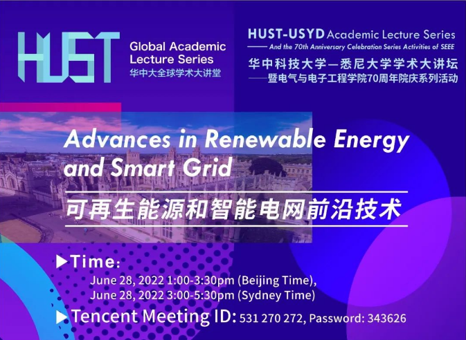 为加强与悉尼大学(USYD)的交流与合作,庆祝华中科技大学(HUST)成立70周年,于2022年6月28日北京时间13:00-16:30(悉尼时间15:00-18:30),在腾讯会议线上举办了题为“可再生能源和智能电网前沿技术”的研讨会。本次的研讨会由华中科技大学徐伟教授组织,华中科技大学文劲宇教授和悉尼大学朱建国教授共同主持。本次论坛共设置了8场精彩报告,内容涵盖储能技术、柔性电力系统、未来净零排放电网、主动磁轴承驱动、双馈直流发电等前沿研究方向。
