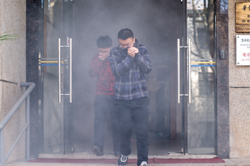 大楼消防疏散以电机楼一楼实验大厅出现火灾为背景,用以教导广大学生在起火的大楼中安全、迅速地撤离。参加演习的和大楼工作人员指导同学们用湿毛巾捂住口鼻,沿着楼梯弯腰前行,按照既定路线迅速有序地撤离了火灾现场,并在安全地带集合。经过全体师生的共同努力,大楼消防疏散工作顺利完成。