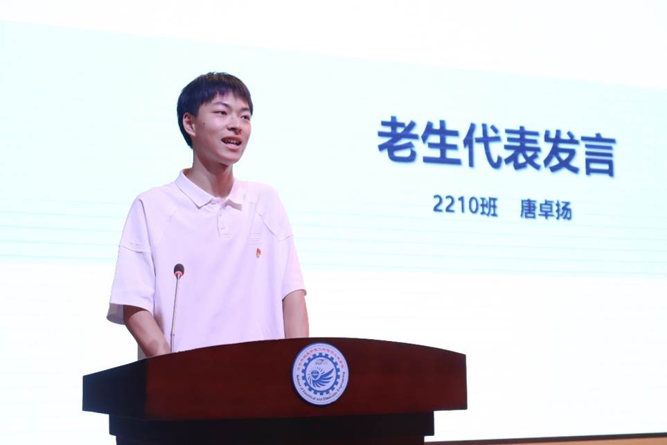 本科2210班唐卓扬同学作为老生代表发言,他从 “森林大学” 的独特视角,向新生们描绘了大学生活的丰富图景,分享了自己在电工基地成长、在答辩汇报中进步的经历。他鼓励新生们敢于走出寝室、尝试新事物,在探索中学会辨别风险、直面挫折,同时传承电气学院“一届带一届、一代帮一代”的温暖传统,在互助中共同成长。
