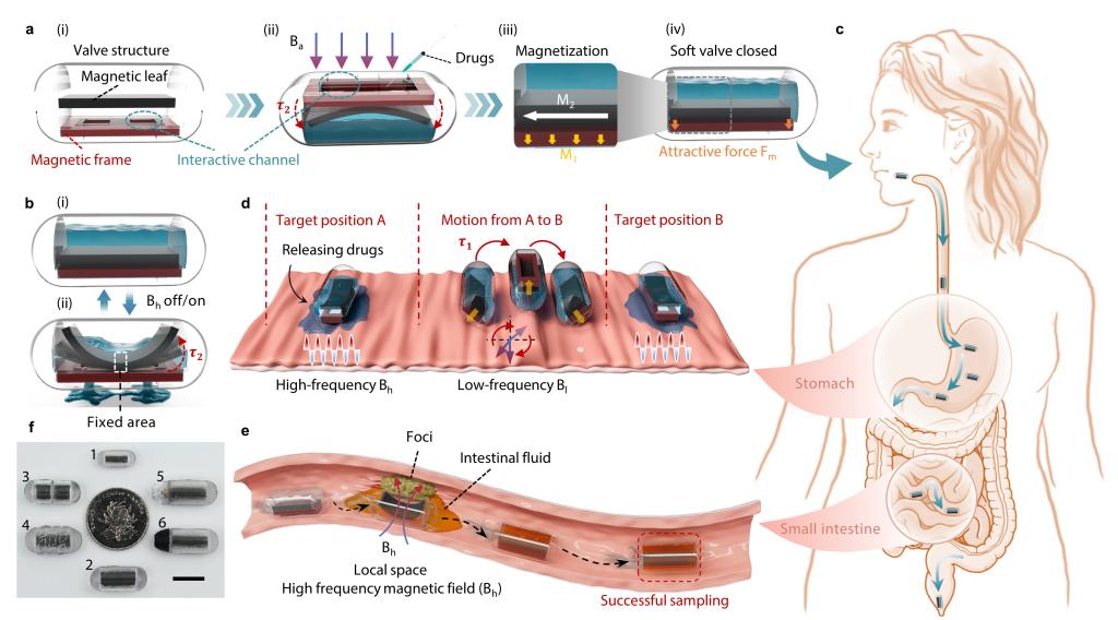 针对上述问题,团队将磁控软体机器人技术引入到胶囊结构设计中,在传统密闭式胶囊本体结构中构造了独特的磁性软体通道(由双层硬磁性软体复合材料构成),并通过梯度磁场力和磁力矩竞争式通道开闭状态调控方法,实现无磁场下的胶囊通道自关闭和外加磁场下的柔性可控开启,为破解胶囊内腔与胃肠道环境间物质双向交互难题提供了有效途径。同时,通过磁性软体通道的单向净剩磁设计以及整体-局部磁动力学响应解耦式驱动,攻克了传统胶囊机器人运动及功能模式单一、拓展性差等瓶颈,为实现胶囊机器人整体主动靶向输运和局部多模态磁响应提供关键技术支撑。在此基础上,团队成功研制集主动靶向输运、定点采样与多重给药等功能于一体的微型(最小尺寸仅5.8×13mm)磁控胶囊机器人系统,涵盖胶囊机器人本体、三维磁驱动线圈-电源-控制装置及应用平台等,并先后通过理想模型实验、动物体外器官模型实验、动物体内实验等功能验证评估,展现出其在胃肠道疾病诊疗中的应用潜力。
