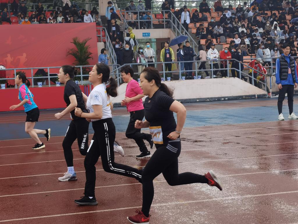 上午的心心相印趣味运动比赛中,我院代表队动作整齐划一,他们出发动作稳健,一路小步紧跟,取得了第二名的好成绩。尽管5日下午有雨,运动场上比赛依然进行着。14:00左右,雨势加大了,但丝毫不影响我院教师参加比赛的热情,赛场上,壮年女子60米比赛中,我院古晓艳、张玲两位老师依然赛出了成绩,赛出了风格。趣味运动场上,一圈到底也准时开赛,我院谌祺老师带领的队伍,也在雨中完成了比赛。